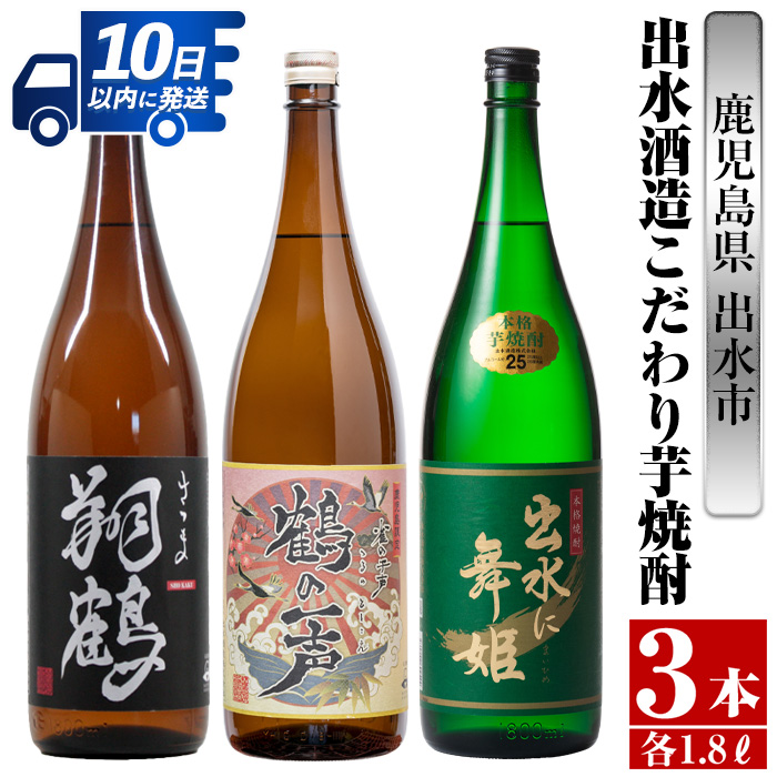 「翔鶴 25度 1800ml」、「鶴の一声 25度 1800ml」、「出水に舞姫 25度 1800ml」が各1本入った、計3本入りです。